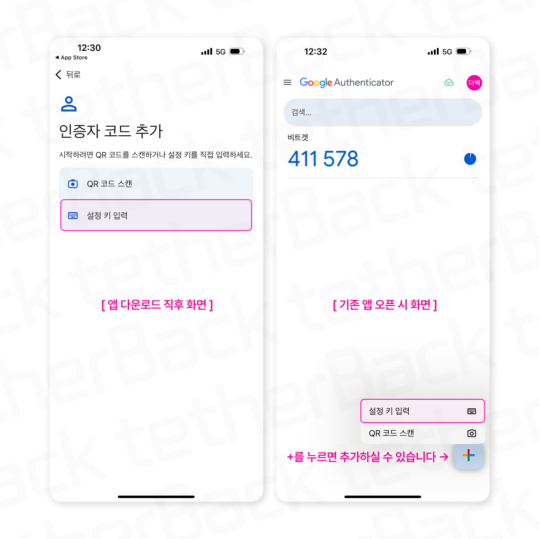 'Google Authenticator' 앱에서 [ 설정 키 입력 ]을 눌러주세요.