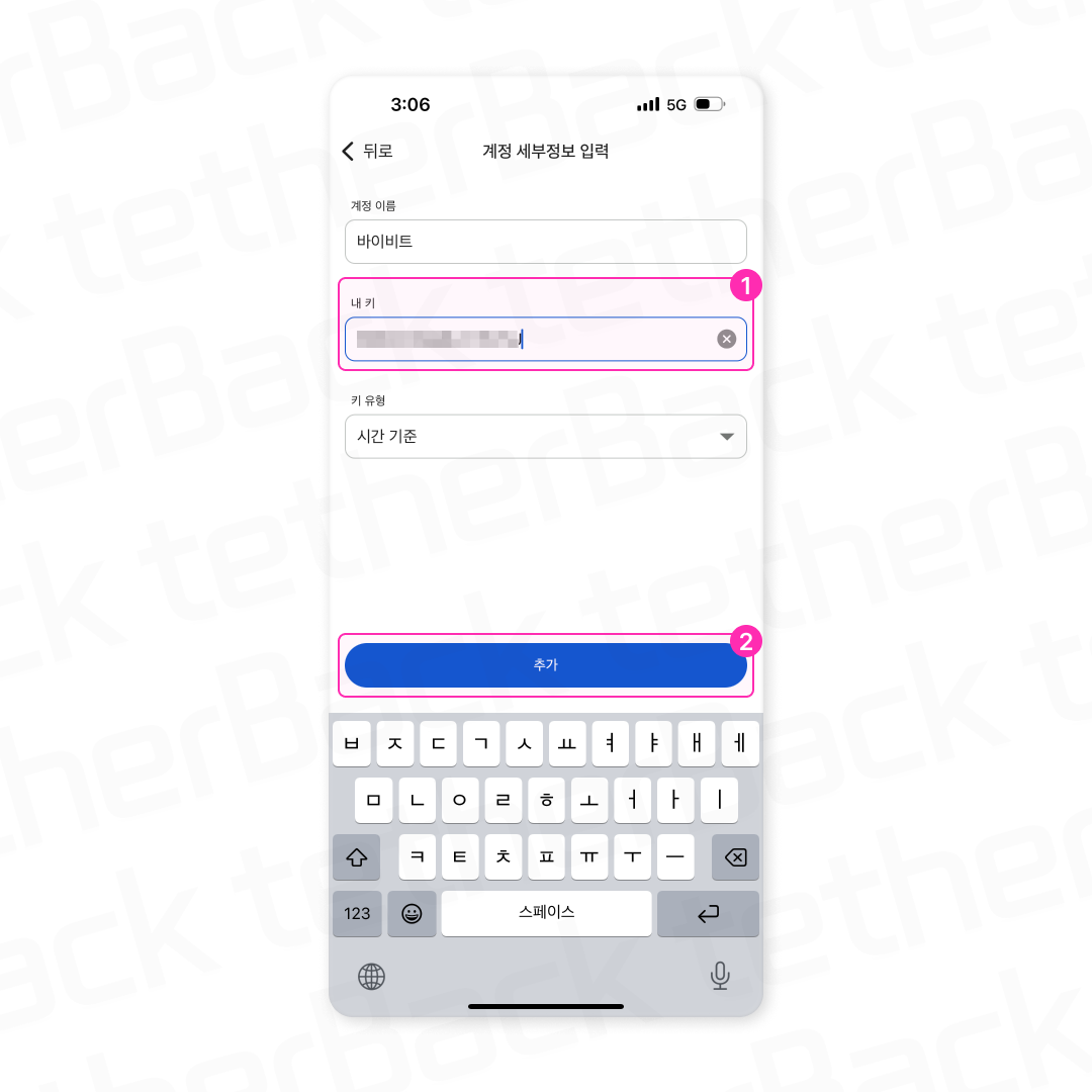 ① '계정 이름'을 설정한 뒤, '내 키'에 바이비트(Bybit)에서 복사한 16자리 KEY를 붙여 넣고,