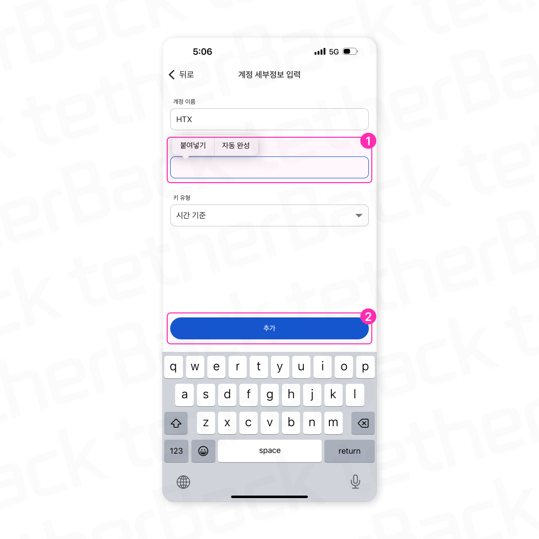 ① '계정 이름'을 설정한 뒤, '내 키'에 후오비(HTX)에서 복사한 16자리 KEY를 붙여 넣고,