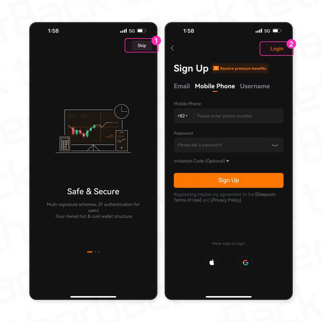 ② 딥코인(DEEPCOIN) 앱에서 [ Login ]을 눌러 로그인해 주세요.