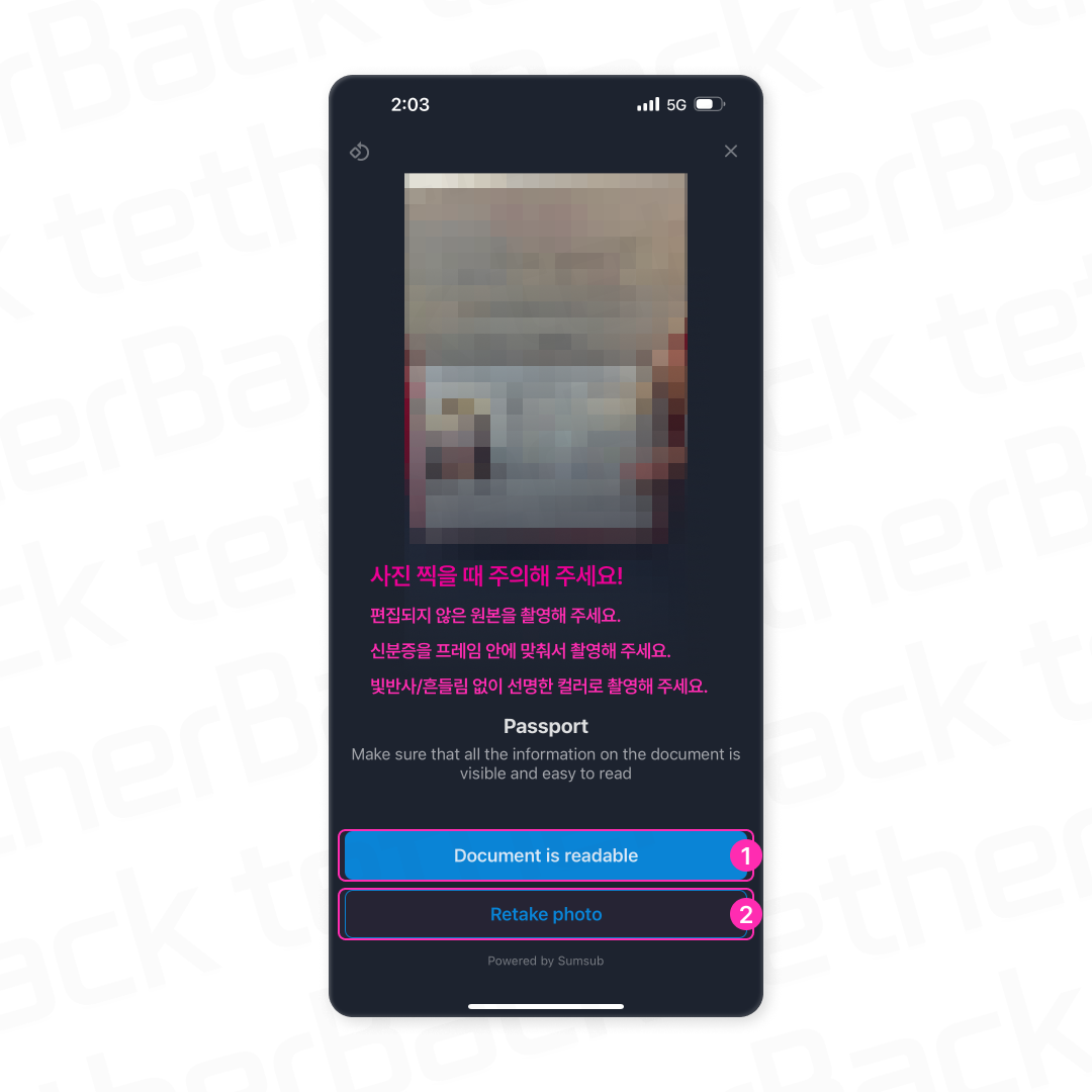 ② 빛 반사 혹은 흔들림으로 인해 얼굴 사진과 글씨가 잘 안 보인다면 [ Retake photo ]를 눌러 재촬영을 진행해 주세요.