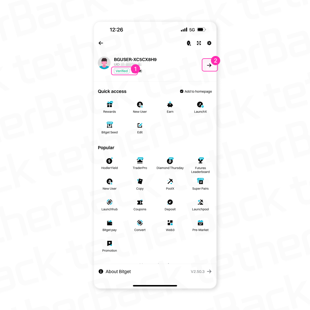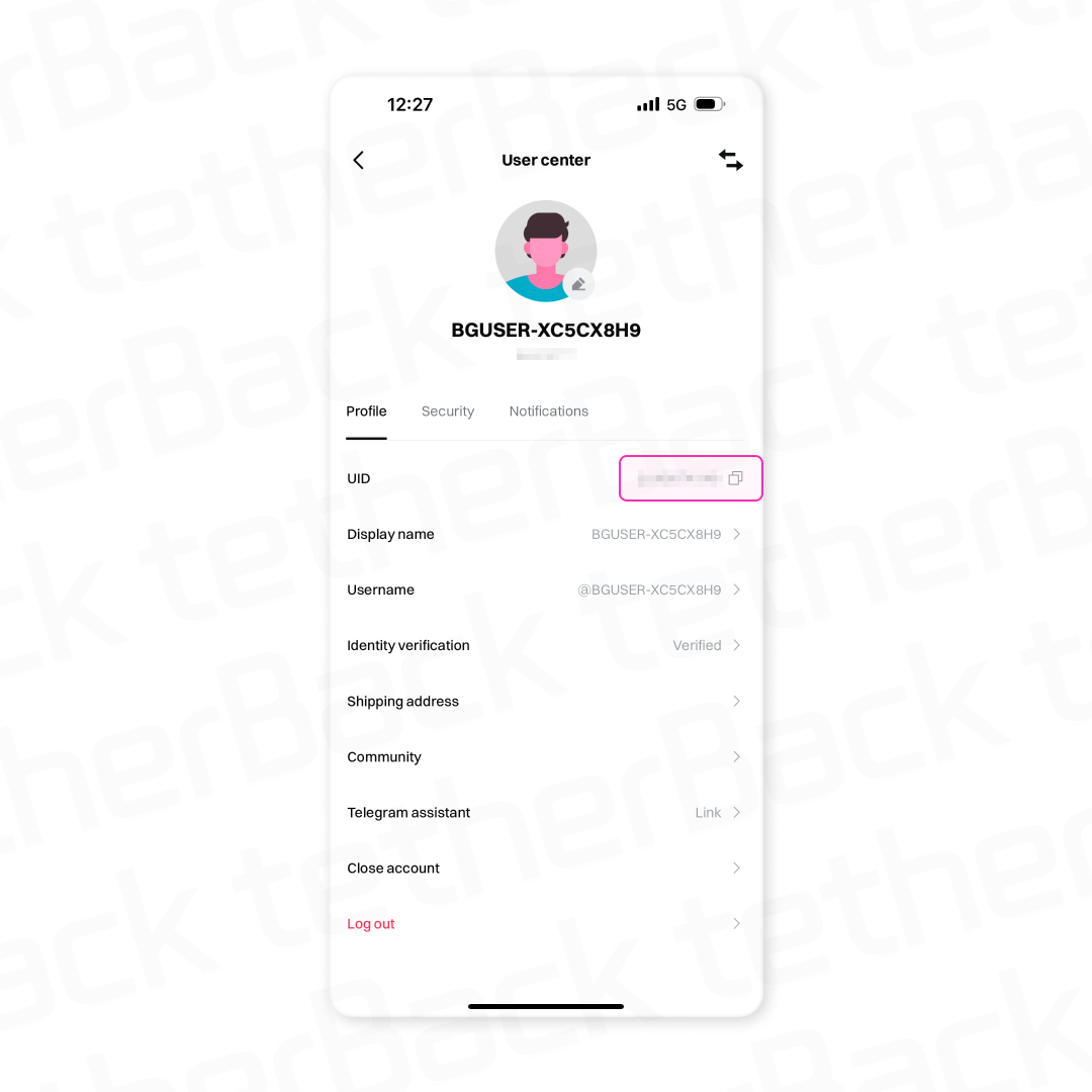 계정 정보 상세페이지에서 'Profile'의 UID [ 복사 아이콘 ]을 눌러 테더백에서 내 거래소를 연동해 주세요.