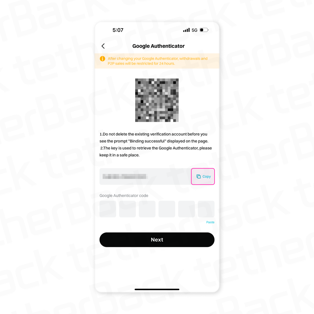 비트겟(Bitget) 앱에서 [ Copy ]를 눌러 16자리 OTP Key를 복사해 주세요.