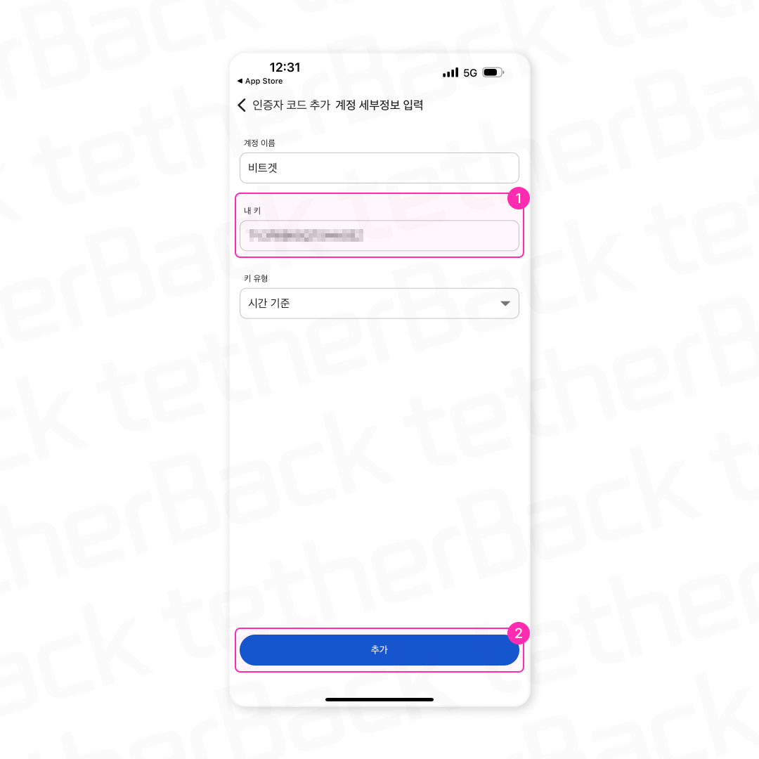 ① '계정 이름'을 설정한 뒤, '내 키'에 비트겟(Bitget)에서 복사한 16자리 KEY를 붙여넣고,