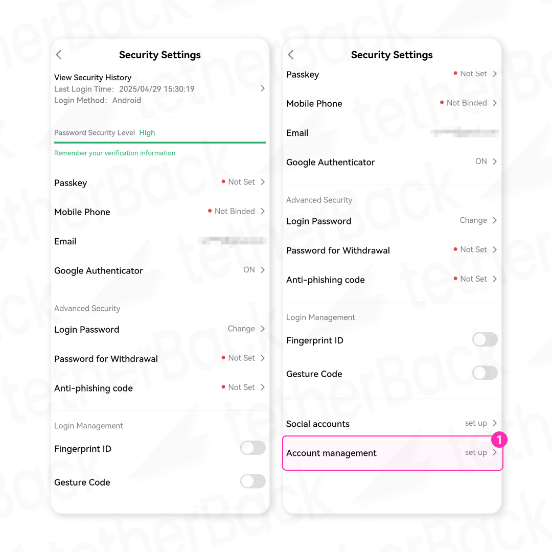 ① 화면을 아래로 스크롤 해 화면 하단의 [ Account management ]를 눌러주세요.
