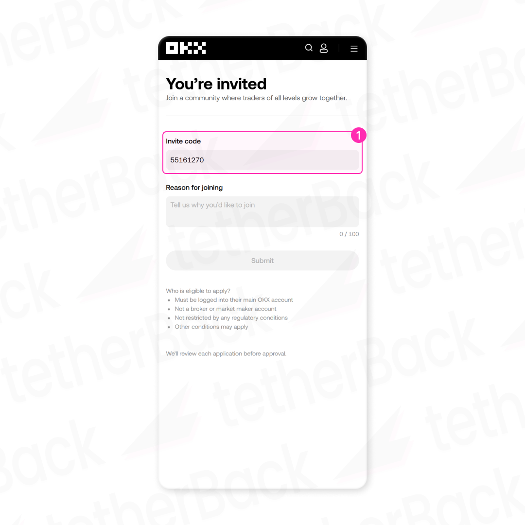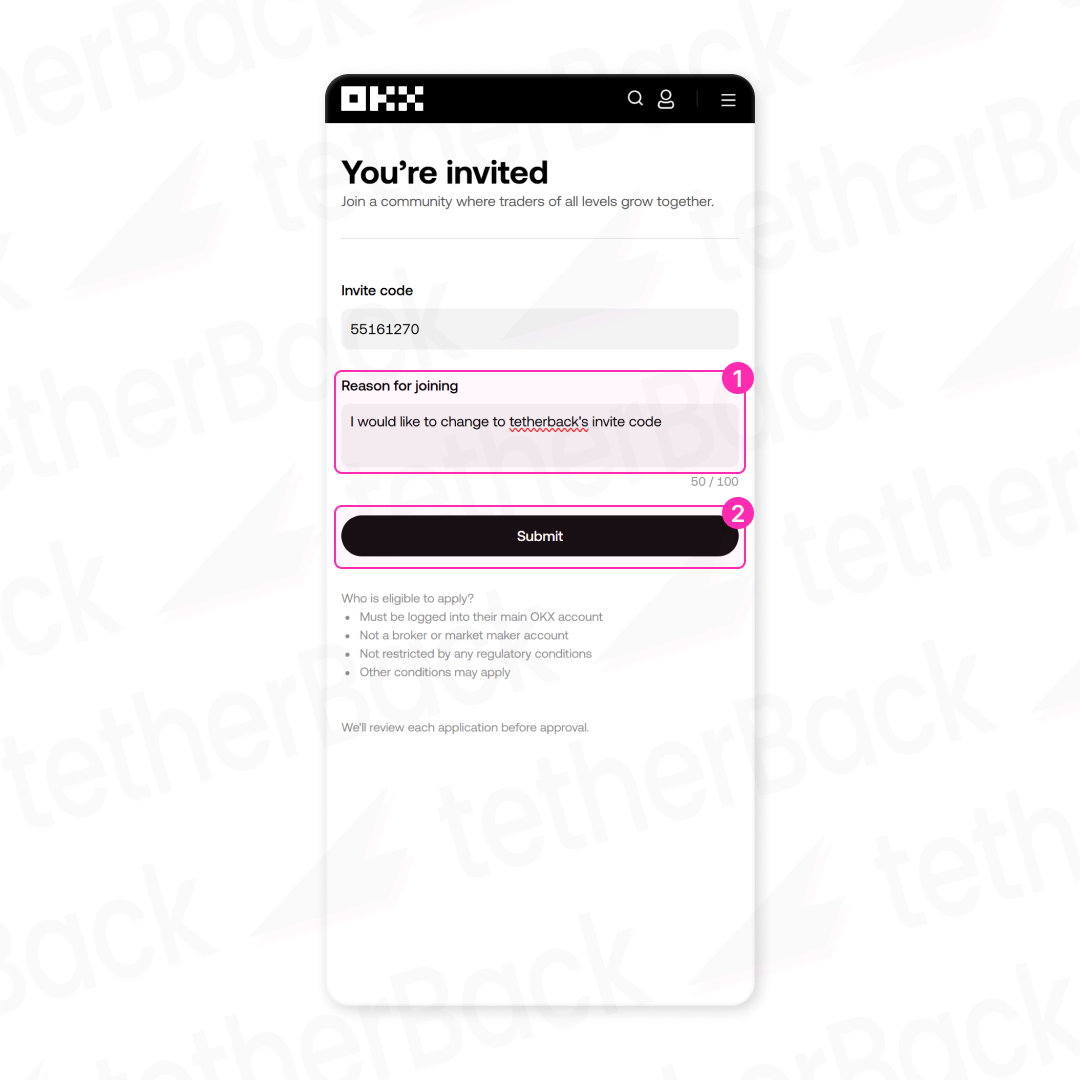 ① Reason for joining란에 I would like to change to tetherback's invite code 를 입력합니다.