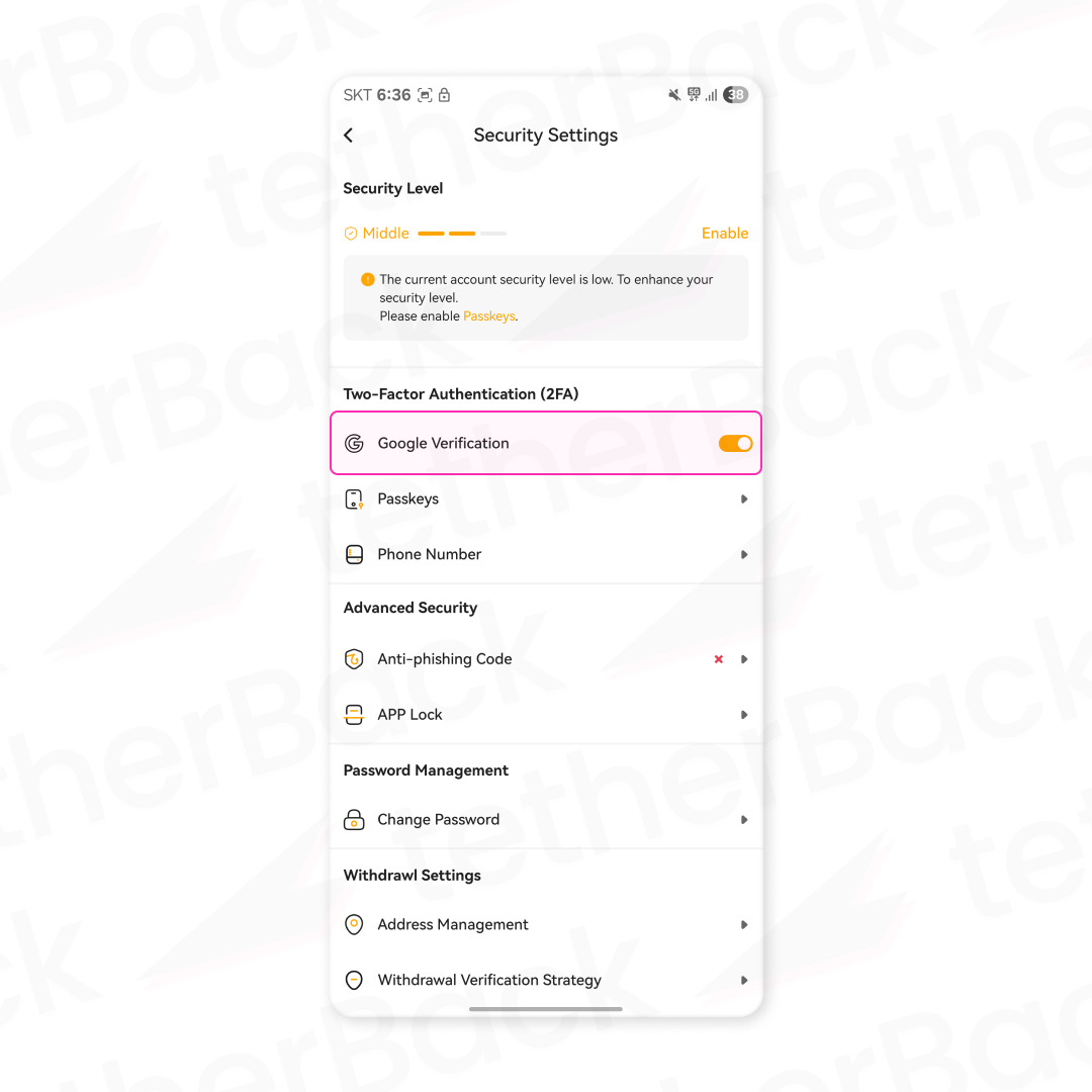 'Google Authenticator' 설정이 되어 있다면 'Google Verification'의 [ 토글 ] 이 노란색으로 활성화된 걸 확인하실 수 있습니다.